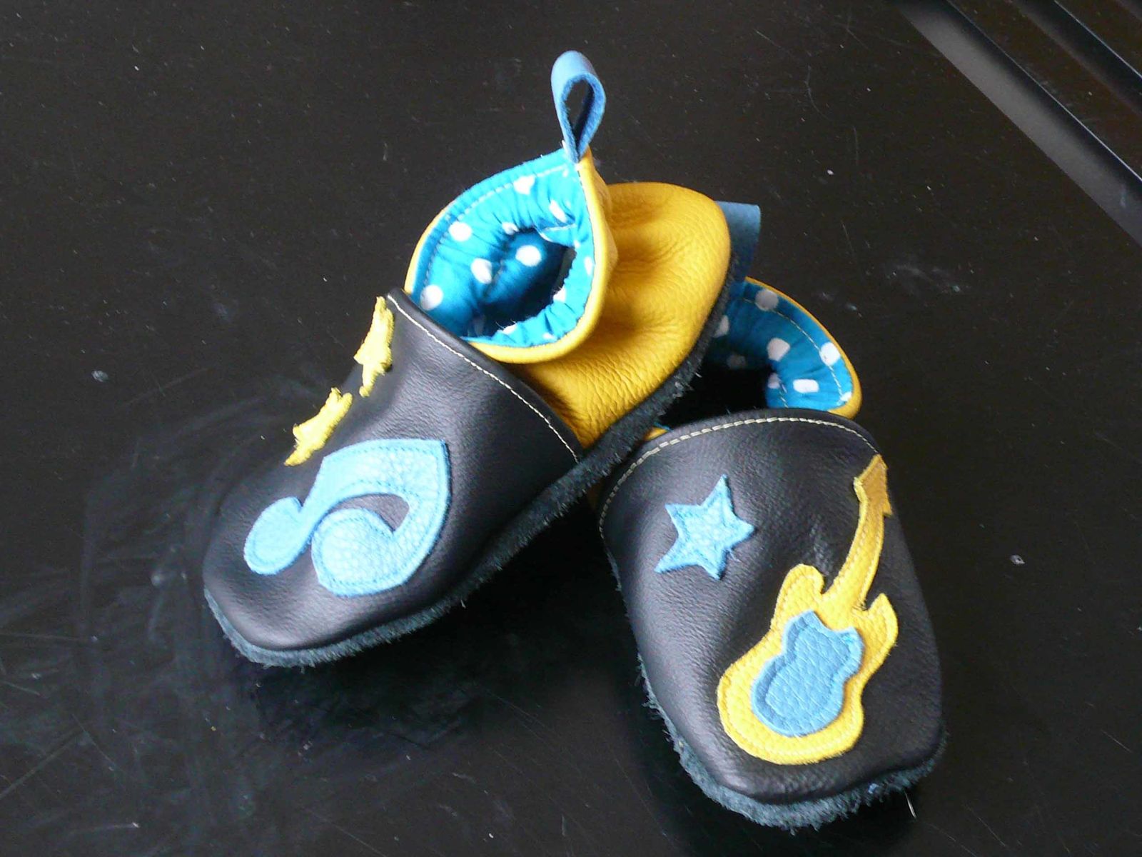 Petits chaussons issus du livre "à petits pas". Ca fait vraiment bizarre de coudre quelque chose de si petit, je me suis dis que jamais il allait rentrer ses pieds dedans...
